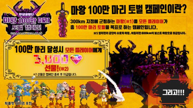 100만 마리 토벌 캠페인은 게임 내 300km 거리에서 군림하는 마왕을 유저가 함께 100만 마리를 토벌하는 것을 목표로 진행되며, 기간 동안 매주 전 세계의 유저들의 마왕 토벌 수 데이터를 합계해 발표한다.