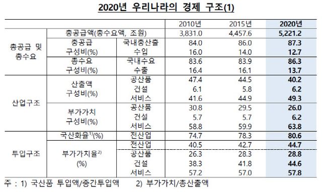 우리나라 경제 구조를 공산품과 건설, 서비스로 나눠보면 2020년 서비스산업의 산출액 구성비율은 49.3%로 2015년(44.9%)보다 4.4%포인트 상승했다. 이는 2000년 이후 가장 큰 비중이다. 반면 공산품과 건설의 산출액구성비는 각각 40.2%, 6.2%로 서비스보다 낮았다.