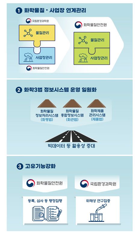 그간 화학 3법에 따른 화학안전 분야 정책 지원 기능이 국립환경과학원과 화학물질안전원으로 분산돼 있어 통합적 관리에 한계가 있었다. 이번 기능 조정으로 화학물질안전원은 기존의 화학사고 예방·대응뿐 아니라 화학물질의 최초 등록부터 생산, 화학제품으로의 활용까지 전(全) 주기 화학물질 안전 관리를 담당하게 된다. 국립환경과학원(환경건강연구부)은 위해성 평가 및 대체시험법 개발 등 기존에 강점이 있는 연구 기능을 강화한다.