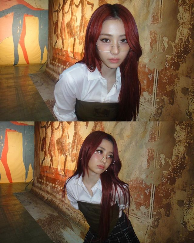 최근 안경에 푹 빠진 듯한 안유진은 스트라이프 패턴 셔츠와 옴므 걸스의 넥타이를 매치한 스쿨 걸 룩에 무테안경을 빼놓지 않고 매치했다. 안유진의 매력 포인트인 ‘안광’을 조금도 가리지 않고, 오히려 더욱 돋보이게 만드는 무테안경의 매력은 단순한 안경 그 이상의 매력으로 사랑받는 중.