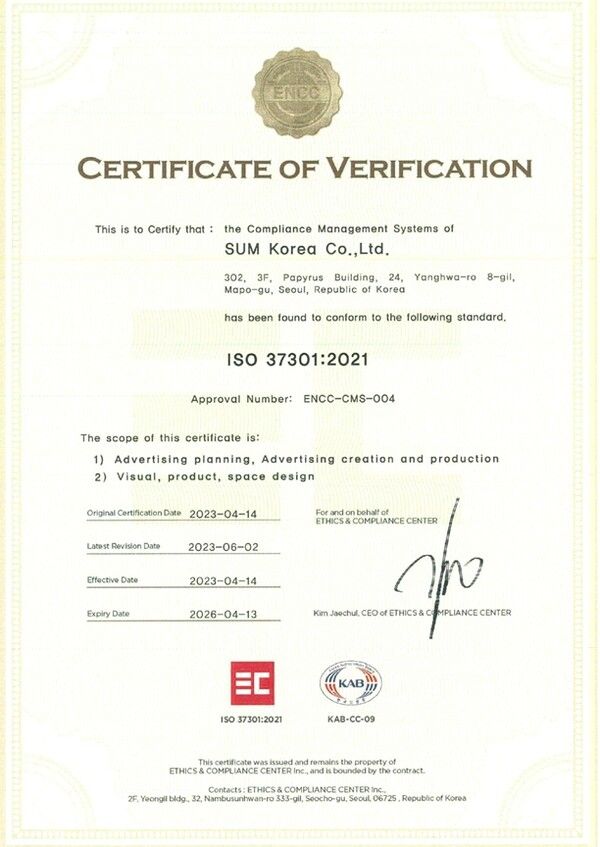 [폴리뉴스 김승훈 기자] 브랜딩 솔루션 기업 ㈜썸코리아(대표 백지희)는 ICR 국제인증원으로부터 ISO37301(규범준수경영시스템) 인증 사후 심사를 통과해 재인증을 받았다고 29일 밝혔다.