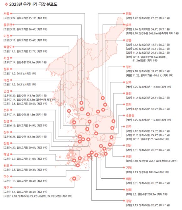 2023년 우리나라는 2022년부터 이어졌던 남부지방의 긴 기상 가뭄이 해소된 후 곧바로 이어진 여름철 집중호우, 3월의 때 이른 고온 현상, 9월의 때늦은 고온 현상과 극심한 기온변동폭 등 양극화된 날씨의 특징을 보였다.