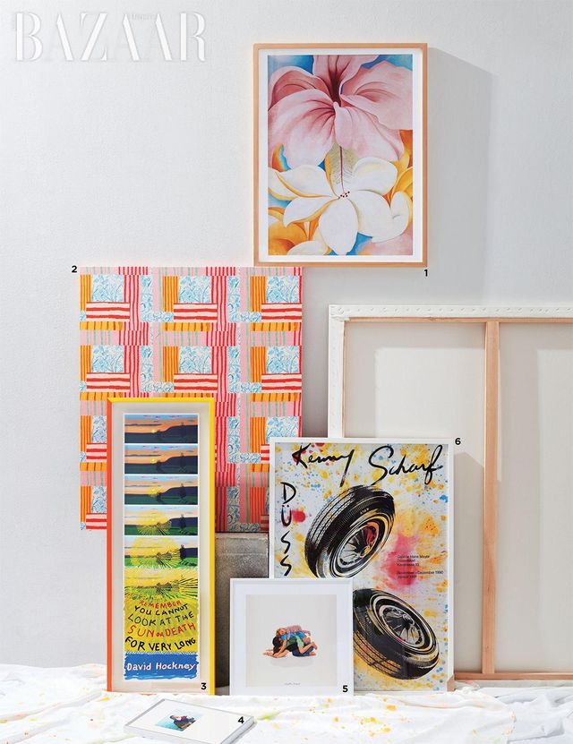 1, 4 조지아 오키프의 〈Hibiscus with Plumeria〉 오리지널 포스터는 16만원, 비비안 호아킴의 〈Dousha Balit〉 시리즈는 15만원 Pagemail. 2 사키와의 협업으로 완성한 한정판 패브릭 포스터는 18만원 Print Bakery. 3 5개 도시 옥외 스크린에 전시했던 데이비드 호크니의 〈Remember You Cannot Look at the Sun or Death for Very Long〉 포스터는 1백80만원 Void Villa. 5 일러스트레이터 지젤 데켈의 〈Childpose〉는 6만원대 Artish. 6 케니 샤프의 〈Untitled〉 아트 포스터는 29만원 Shabi Workshop.