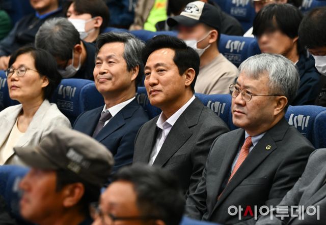 오세훈 서울시장이 30일 서울 동작구 숭실대학교에서 열린 2024년 서울시 희망의 인문학 입학식에서 인문학 참여자 사례를 듣고 있다. 오른쪽부터 장범식 숭실대학교 총장, 오 시장, 원용걸 서울시립대총장. /정재훈 기자