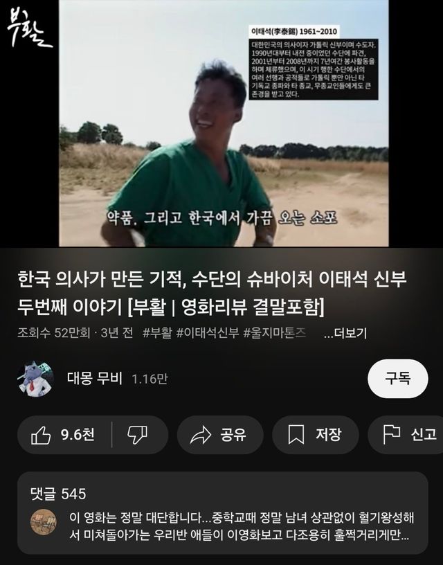 영상에는 죽어서도 사는 이태석 신부라는 반응과 함께 이태석 신부를 그리워하는 사람들의 댓글이 이어지고 있다. 특히 세상을 바꾼 진정한 일꾼이라는 이야기에 많은 공감이 이어지고 있다.