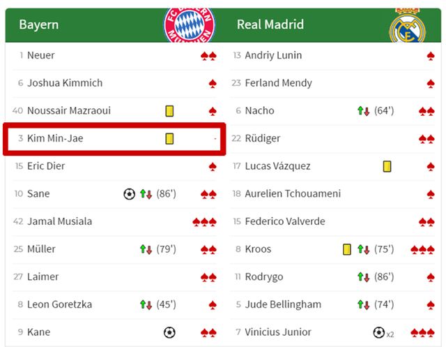 스페인 매체 아스는 1일(한국시간) 독일 뮌헨의 알리안츠 아레나에서 열린 바이에른 뮌헨과 레알 마드리드의 2023~24 유럽축구연맹(UEFA) 챔피언스리그 4강 1차전 2-2 무승부 직후 양 팀 선수들의 평점을 공개했다. 아스는 스페이드(♠) 개수로 평점을 구분하고 3개가 만점인데, 김민재는 아예 단 1개도 받지 못했다. 양 팀 선수들 가운데 평점을 받지 못한 건 김민재뿐이다.