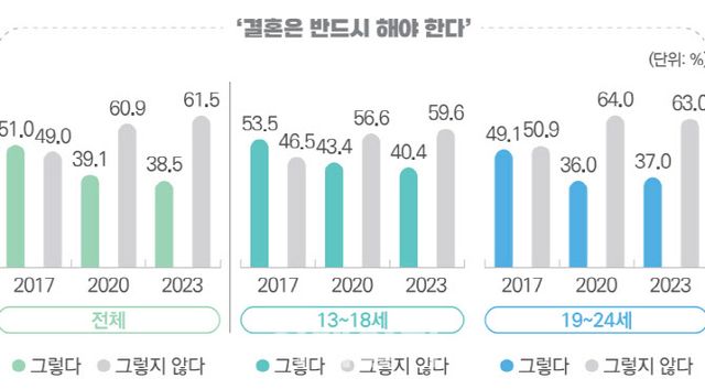 여성가족부가 1일 공개한 2023년 청소년종합실태조사에 따르면 ‘결혼을 반드시 해야 한다’고 응답한 비율은 38.5%로 지난 2020년 조사(39.1%) 보다 소폭 낮아졌다. ‘결혼은 필수’라는 인식이 차츰 변하고 있는 것이다. 이번 조사는 ‘청소년 기본법’에 따라 3년마다 실시하는데 이번에는 전국 5000가구의 주 양육자와 9~24세 청소년 7423명을 대상으로 했다.