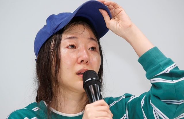 그룹 뉴진스의 소속사 어도어 민희진 대표가 지난달 25일 서울 서초구 한국컨퍼런스센터에서 하이브 경영권 탈취 시도와 관련한 배임 의혹에 긴급기자회견을 갖고 눈물을 흘리며 입장을 밝히고 있다. / 뉴스1