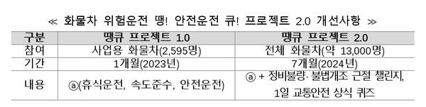 특히, 사업대상 운전자 범위를 사업용에서 전체 화물차 운전자로 확대하고, 사업기간도 기존 1개월에서 7개월로 늘려 땡큐 프로젝트 참여자 수를 10배 이상 증가시키는 것을 목표로 하고 있다.