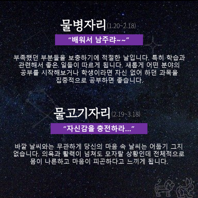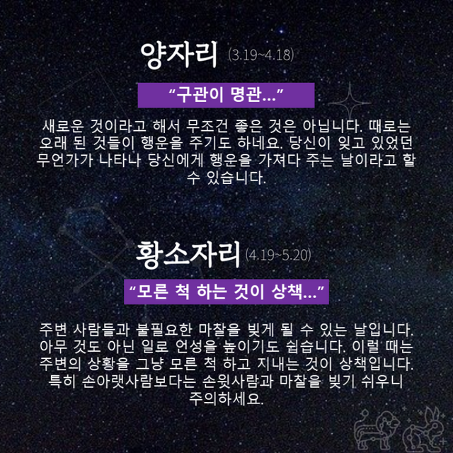 커플인 분이라면 상대방과 함께 하는 짧은 여행도 좋습니다. 기분도 전환하고 상대방을 향한 사랑을 좀더 키울 수도 있고요. 싱글인 분의 경우 편안한 만남이 아니라면 피하세요. 오늘 당신의 컨디션이 최상은 아니니 괜스레 나쁜 인상만 심어줄 수 있습니다.
