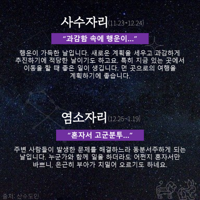 행운이 가득한 날입니다. 새로운 계획을 세우고 과감하게 추진하기에 적당한 날이기도 하고요. 특히 지금 있는 곳에서 이동을 할 때 좋은 일이 생깁니다. 먼 곳으로의 여행을 계획하기에 좋습니다.