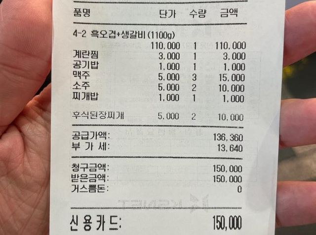 A씨가 공개한 계산서에 따르면 A씨 일행은 흑돼지 오겹살과 생갈비를 합해 총 1100g의 고기를 100g당 1만 1000원의 값을 치르고 먹었다.
