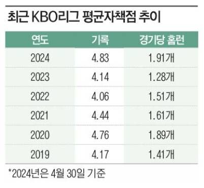 투수는 울고 타자는 웃었다. 개막 후 4월까지 KBO리그 팀 평균자책점은 2018년 이후 최고인 4.83(2023시즌 4.14)이었다. 팀 타율은 전년 대비 0.011 오른 0.274. 특히 경기당 홈런이 1.91개(2023시즌 1.28개)에 이르렀다.