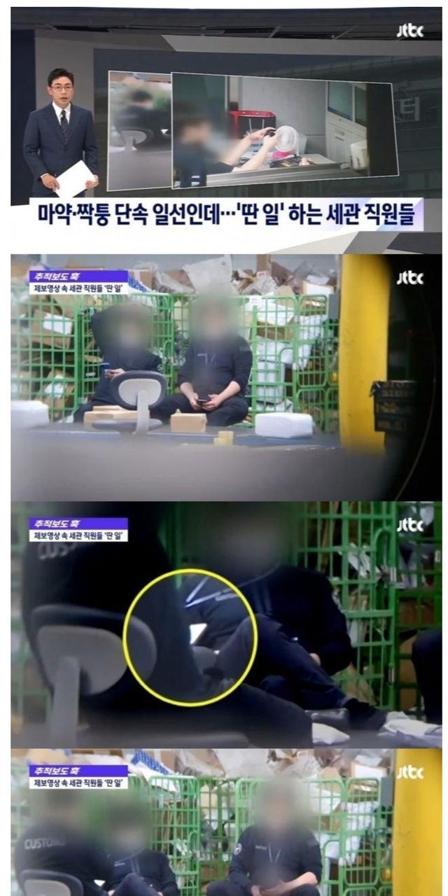 관세청 직원이 고개를 숙이고 휴대전화를 보고 있습니다.