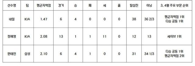 삼성 원태인은 등판한 6경기에서 4승을 거둬 다승 부문 공동 1위를 차지했다. 특히 4월 9일 사직 롯데전부터 4월 26일 고척 키움전까지 4연승을 올리고, 최근 두 경기는 자책점을 허용하지 않아 평균자책점도 2.10으로 KIA 네일에 이어 2위에 올랐다. 원태인은 매 경기 ‘계산이 서는 선발투수’의 모습을 보이며 삼성의 상승세를 주도했다.