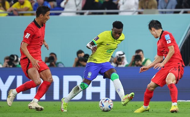 2022년 12월 6일 카타르 도하 974 스타디움에서 열린 2022 카타르 월드컵 16강전 대한민국과 브라질의 경기에서 브라질 비니시우스 주니오르가 정우영(왼쪽), 김문환 사이에서 개인기를 시도하고 있다. / 연합뉴스