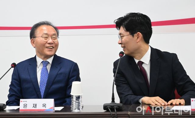 아시아투데이 이병화 기자 = 윤재옥 국민의힘 원내대표 겸 당 대표 권한대행과 조정훈 총선 백서 TF 위원장이 2일 서울 여의도 중앙당사에서 열린 제22대 총선 백서 TF 제1차 전체회의에서 대화를 나누고 있다.