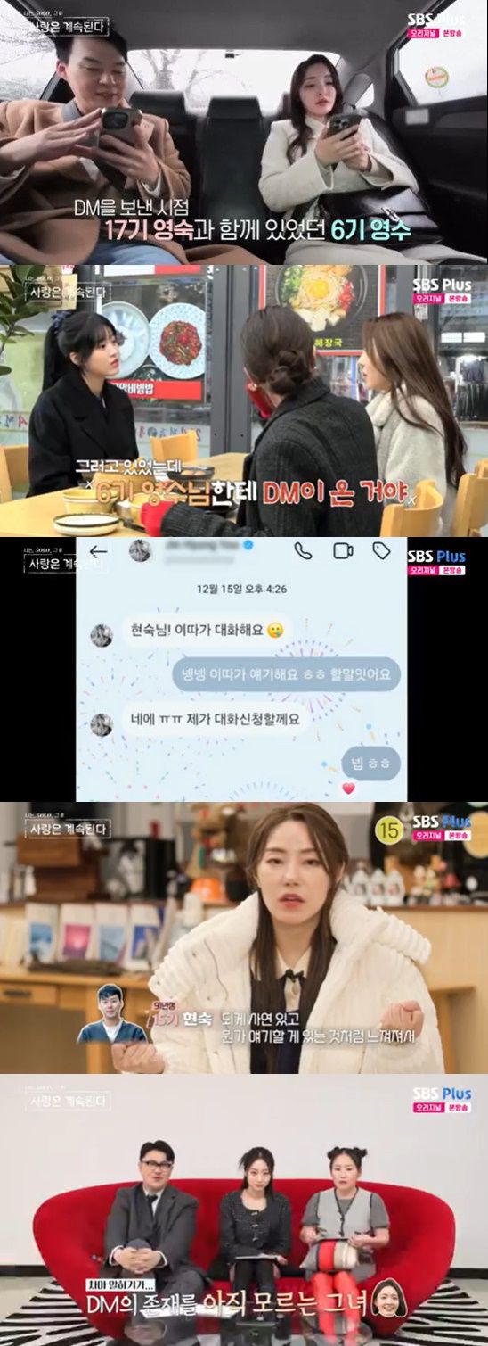 그러나 남자들의 선택이 끝난 후 17기 영숙과 함께 있을 때 6기 영수는 15기 현숙에게 "이따가 대화해요"라며 DM을 보냈다.