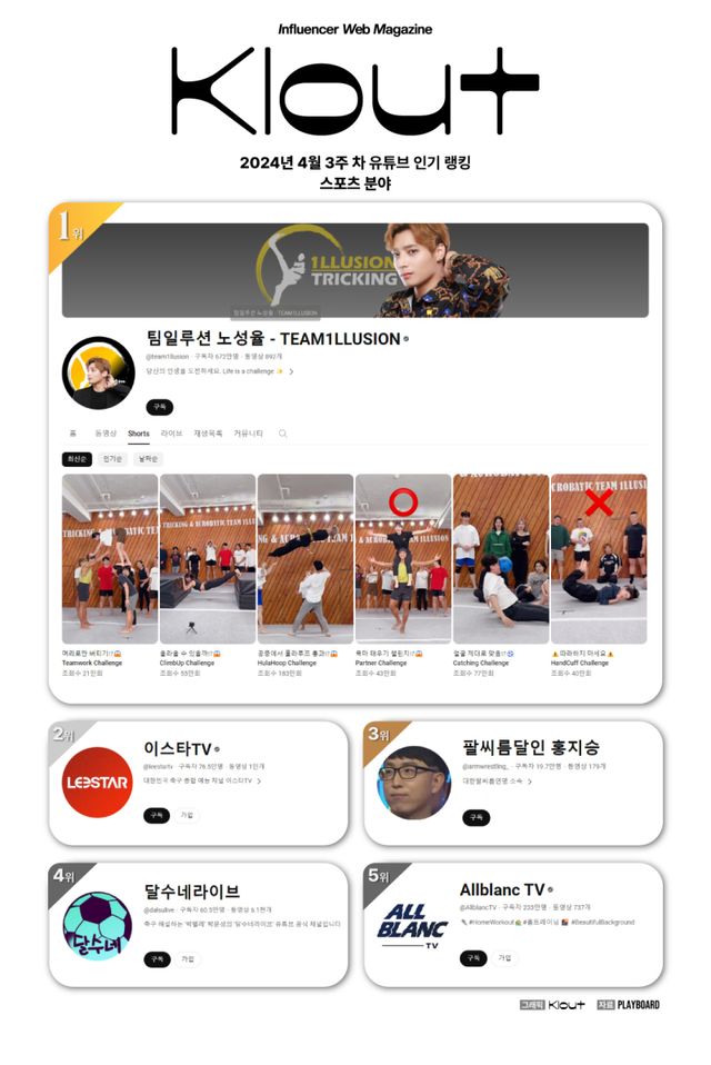 한편 2위는 대한민국 축구 종합 예능 채널 '이스타TV', 3위 대한팔씨름연맹(KAF) 소속 홍지승 선수가 운영하는 '팔씨름달인 홍지승', 4위 축구 해설위원 박문성이 운영하는 '달수네라이브', 5위는 홈트레이닝 채널 'Allblanc TV'가 뒤를 이었다.