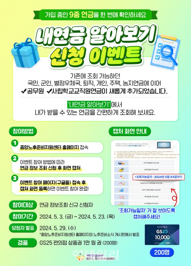 아울러 공단은 ‘공·사 연금 통합조회 서비스’ 구축 완료를 기념해 전 국민을 대상으로 23일까지 3주간 경품 행사를 진행한다. 누리집에 접속 후 ‘내연금 알아보기’에서 통합 조회를 신청하고, 그 화면을 장면을 갈무리해 응모하면 된다. 응모자 중 200명을 추첨해 모바일 교환권을 지급하며 추첨 결과는 29일(수) ‘NPS 중앙노후준비지원센터’ 누리집에서 공개할 예정이다.