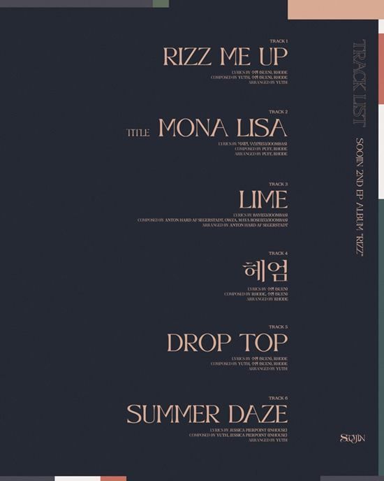 공개된 트랙리스트에 따르면 ‘RIZZ’에는 타이틀곡 ‘MONA LISA(모나리자)’를 비롯해 ‘RIZZ ME UP(리즈 미 업)’, ‘Lime(라임)’, ‘헤엄’, ‘DROP TOP(드롭 톱)’, ‘Summer Daze(서머 데이즈)’까지 각양각색 매력의 6트랙이 담겼다.