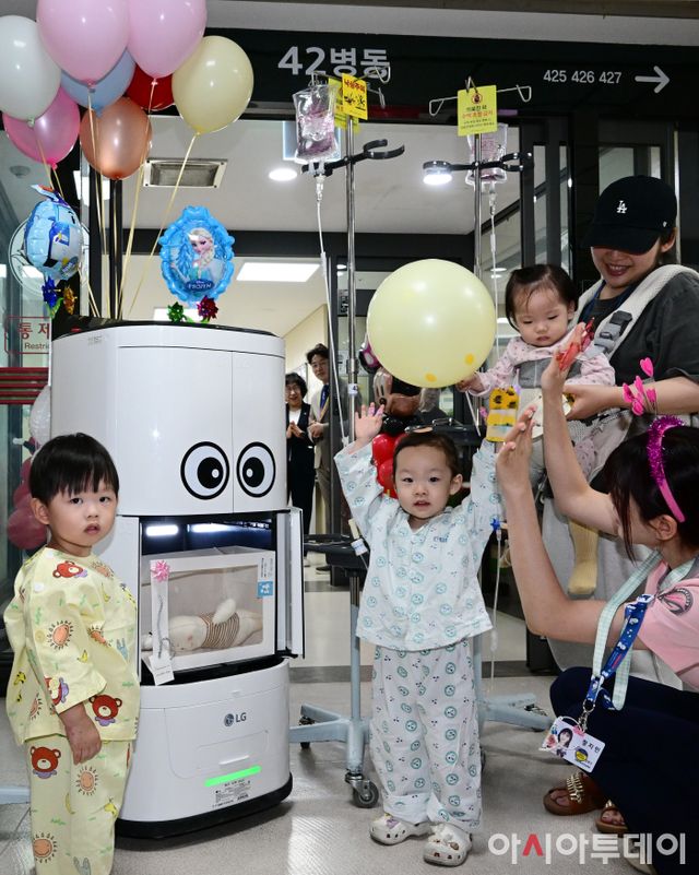 아시아투데이 박상선 기자 = 어린이날은 앞둔 3일 경기도 안양시 한림대성심병원 본관 42병동에서 열린 어린이날 기념 선물 전달식에서 입원하고 있는 어린이들이 의료진을 보조하는 자율주행 배송 로봇에게 인형 선물을 받고 기뻐하고 있다.