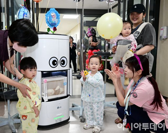 아시아투데이 박상선 기자 = 어린이날은 앞둔 3일 경기도 안양시 한림대성심병원 본관 42병동에서 열린 어린이날 기념 선물 전달식에서 입원하고 있는 어린이들이 의료진을 보조하는 자율주행 배송 로봇에게 인형 선물을 받고 기뻐하고 있다.