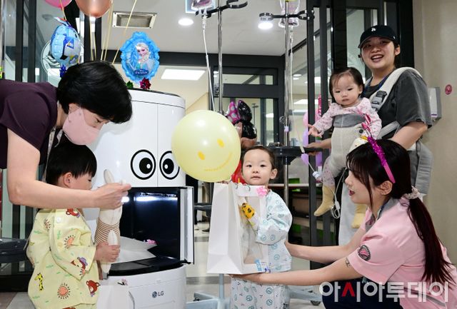 아시아투데이 박상선 기자 = 어린이날은 앞둔 3일 경기도 안양시 한림대성심병원 본관 42병동에서 열린 어린이날 기념 선물 전달식에서 입원하고 있는 어린이들이 의료진을 보조하는 자율주행 배송 로봇에게 인형 선물을 받고 기뻐하고 있다.
