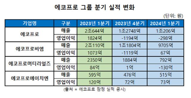 앞서 전날(2일) 에코프로는 1분기 연결기준 매출액 1조206억원, 영업손실 298억원을 기록했다고 밝혔다. 전년 동기 대비 매출액은 50.6% 줄었으며 영업손익은 1824억원 이익에서 적자로 돌아섰다. 전기차 시장 수요가 둔화하며 양극재, 전구체 등을 생산하는 에코프로그룹의 실적이 일제히 악화한 것이다.
