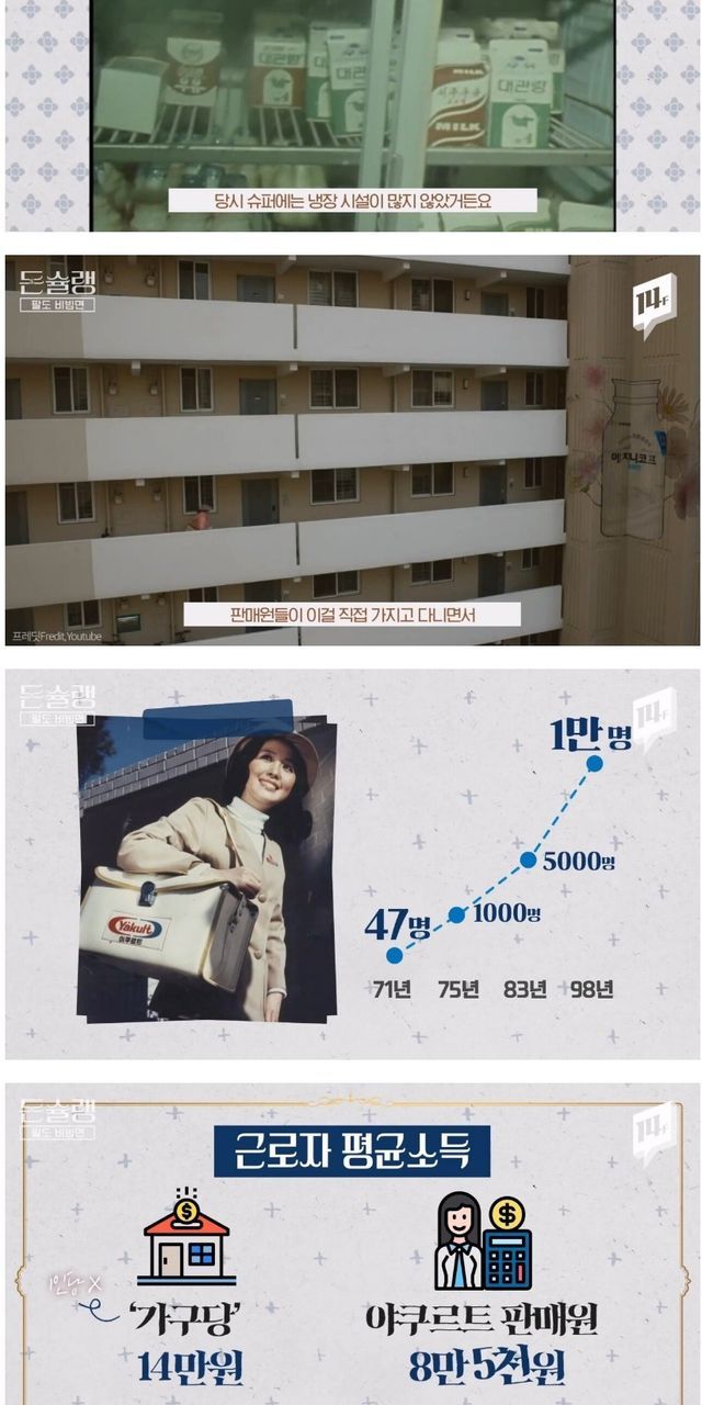 당시 주부들의 직장이 적던시절에 야쿠르트 아줌마들을 모집해서 판매함