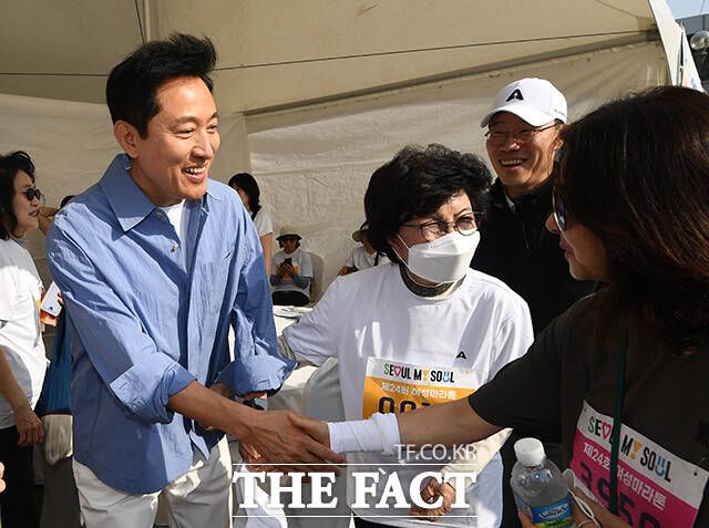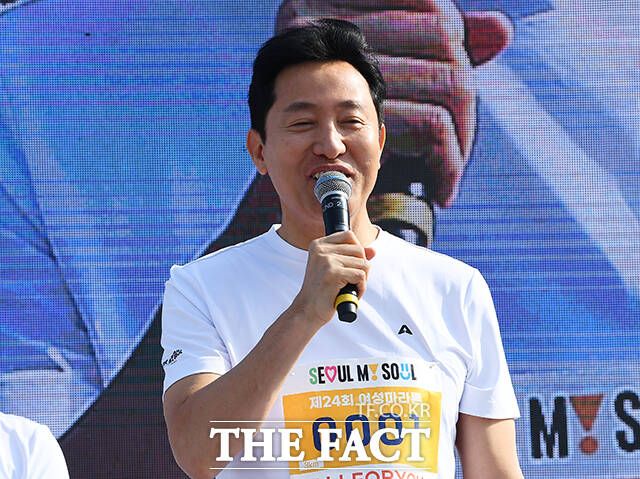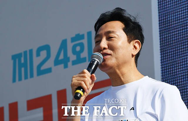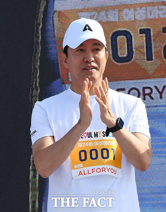 [더팩트ㅣ이동률 기자] 오세훈 서울시장이 4일 오전 서울 마포구 월드컵공원에서 열린 제24회 여성마라톤대회에 참석해 환영사를 하고 있다.