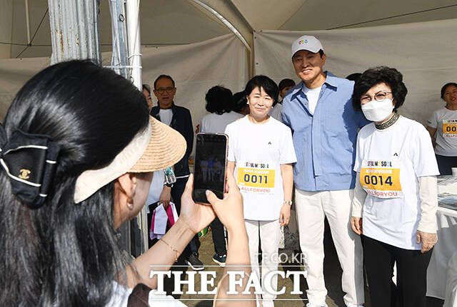 오세훈 서울시장이 4일 오전 서울 마포구 월드컵공원에서 열린 제24회 여성마라톤대회에 참석해 내빈들과 기념촬영을 하고 있다.