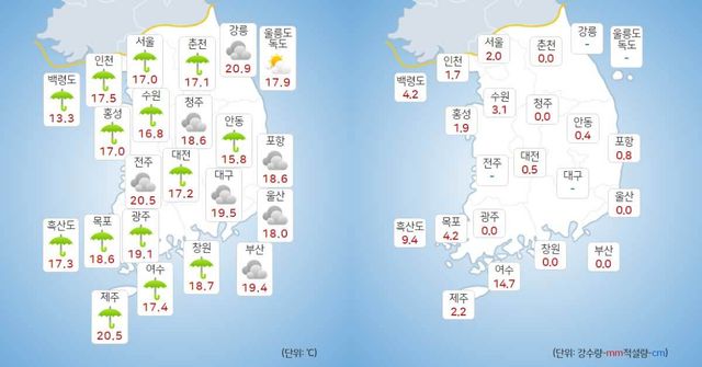 지역별 아침 최저기온과 낮 최고기온은 서울 17도, 19도, 인천 17도, 19도, 수원 16도, 18도 등으로 다소 선선한 날씨가 예상된다.