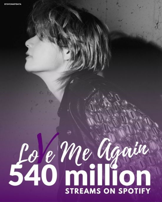 방탄소년단(BTS) 뷔의 솔로곡 '러브 미 어게인'이 스포티파이에서 5억 4,000만 스트리밍을 넘어서며 큰 인기를 끌고 있다.