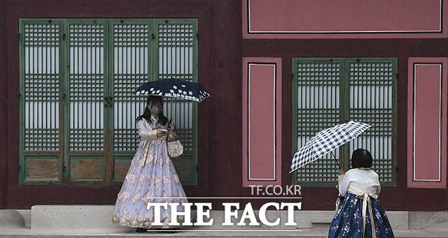 [더팩트ㅣ이동률 기자] 전국적으로 비가 내리는 5일 오전 서울 종로구 경복궁을 찾은 관광객들이 우산을 쓰고 관람을 하고 있다.