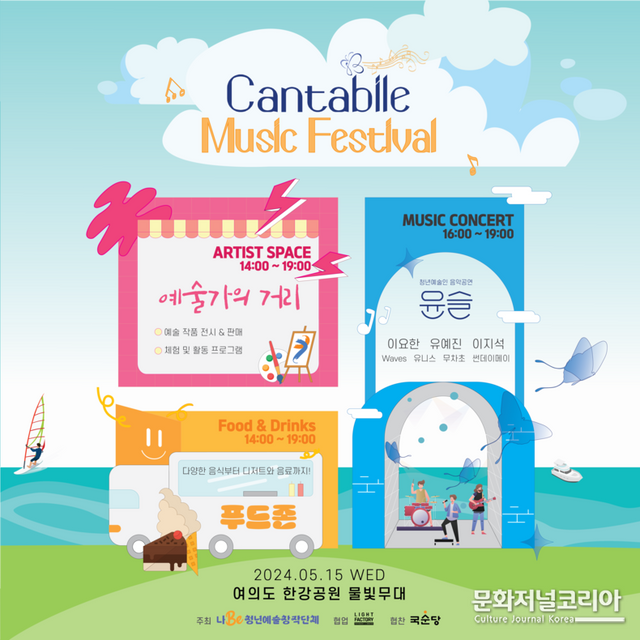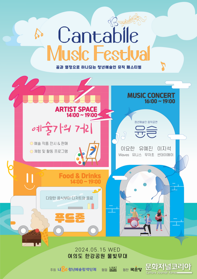 문화저널코리아 김기범 기자 | 나Be청년예술창작단체가 오는 5월 15일 여의도 한강공원 물빛무대 일대에서 ‘칸타빌레 뮤직 페스티벌(Cantabile Music Festival)’을 개최한다.
