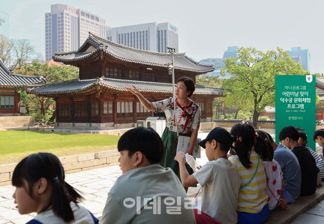 하나금융그룹은 지난 4일 어린이날을 맞아 취약계층 아동을 위한 임직원 참여 ‘문화체험 프로그램’ 봉사활동을 실시했다. 이날 덕수궁 역사교육 문화체험 프로그램에 참여한 아동들이 역사해설가의 설명을 들으며 문화재를 관람하는 모습.(사진=하나금융 제공)