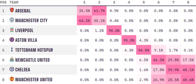 경기 후 축구 통계 전문 업체 옵타에 따르면 토트넘이 4위를 차지할 확률은 36라운드 종료 시점을 기준으로 4.3%로 나타났다. 반면 빌라가 4위를 차지할 확률은 무려 98.8%였다.