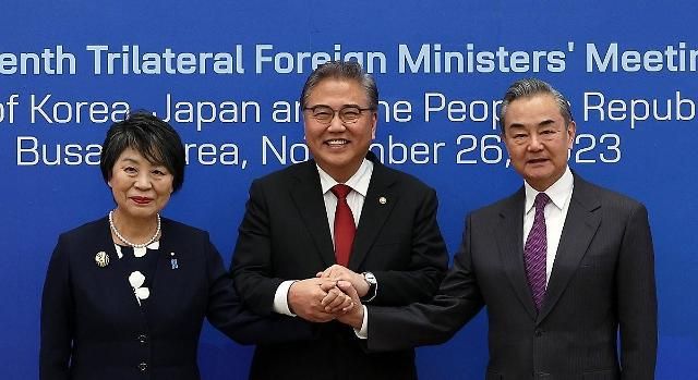 2023年11月26日,在釜山海云台区的APEC世峰楼,韩中日三国外长会晤并握手合影。左起依次为日本外务大臣上川阳子、韩国前外交部长官朴振和中共中央政治局委员兼外交部长王毅。【图片提供 韩联社】