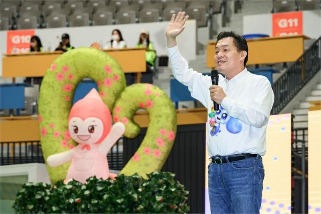 이재준 시장이 3일 수원종합운동장 내 수원체육관에서 어린이날 행사에 참석해 손을 흔들며 인사하고 있다.