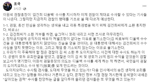조 대표는 6일 자신의 사회관계망서비스(SNS)에 "이원석 검찰총장이 '김건희 디올백' 수사를 지시하자 이제 검찰이 제대로 수사할 수 있다는 기사들이 나오지만, 지금까지 검찰의 행태로 볼 때 다르게 예상한다"며 이같이 말했다.
