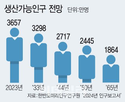 저출생으로 인해 15∼64세에 속하는 생산 가능인구는 2023년 3657만명에서 2044년 2717만명으로 940만명 감소한다. 연구원은 “생산 가능인구 감소는 소비 활력을 떨어뜨려 내수시장 붕괴를 불러오고 노인 부양 부담이 커져 경제성장 속도가 급속히 둔화하면서 장기 저성장이 굳어질 것”이라고 진단했다.