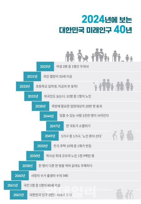 2060년 사망자 수는 74만6000명으로 출생아(15만6000명)의 4.8배가 된다. 이에 따라 인구는 59만명이 자연 감소하게 된다. 2023년 전체 인구의 4.4%(229만명)에 불과했던 80세 이상 초고령자는 2061년 전체의 20.3%(849만명)로 늘어난다. 한국 총인구는 작년 기준 5171만명에서 2065년 3969만명으로 감소해 3000만명대를 기록하게 된다.