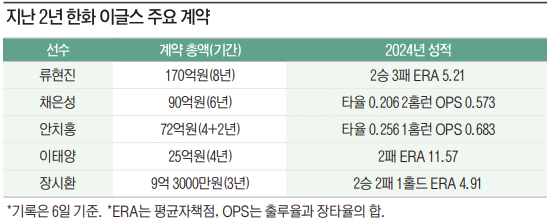 투자로 재미를 본 한화는 지난겨울 지갑을 더 열었다. 최대어 안치홍(4+2년 72억원)과 계약했고 개막 한 달 전 에이스 류현진을 8년 170억원에 복귀시켰다. 잔류시킨 장민재(2+1년 최대 8억원)까지 세 선수에게만 250억원을 투자했다. 1년 전 계약까지 합치면 총 379억 3000만원을 쓴 것이다.