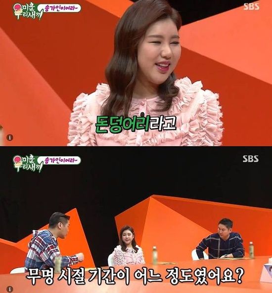 송가인은 지난 2020년 SBS '미운 우리 새끼'에 스페셜 MC로 출연 당시 "과거 미운 우리 새끼였던 적도 있냐"라는 질문에 "그전에는 수입도 없었고 활동도 많이 못하니까 눈치가 보였다"고 털어놨다.