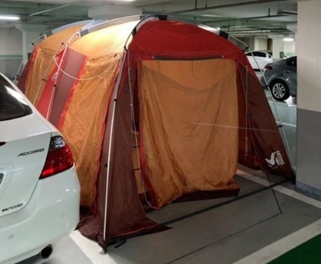 그는 "사이즈도 사이즈거니와 안에 침낭도 있었고 모기향 피운 흔적까지 있었다"며 "텐트 주위에서 모기향 냄새 엄청 많이 났다"고 소개했다. 그러면서 "주차 칸 2칸이나 먹고 대체 뭐냐"고 따졌다.