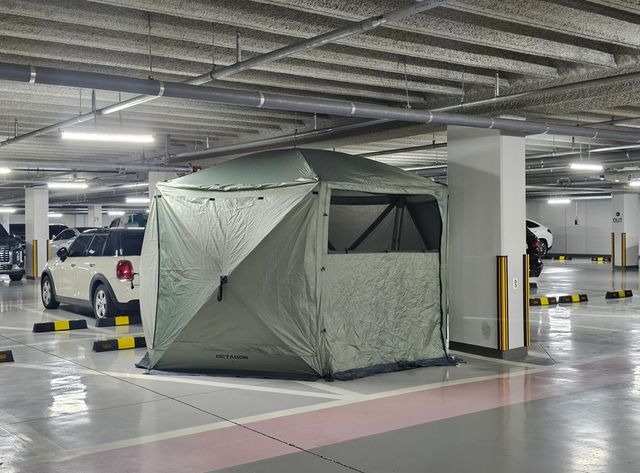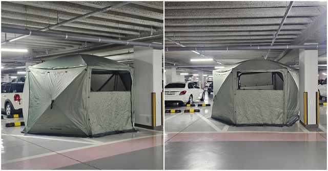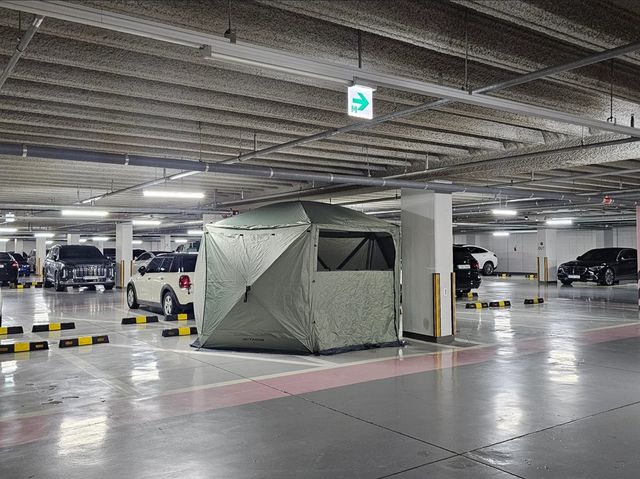 글쓴이가 첨부한 사진에는 지하 주차장 한쪽에 카키색 캠핑용 텐트가 설치된 모습이다. 텐트는 어림잡아 일반 승용차 1.5대 크기로, 주차 라인을 넘어간 채 장착된 상태였다.