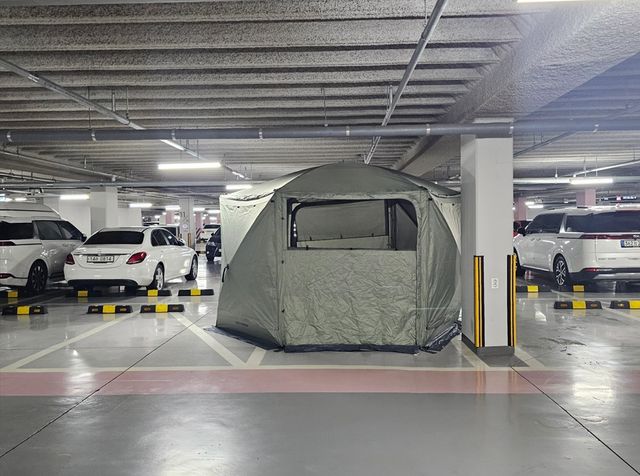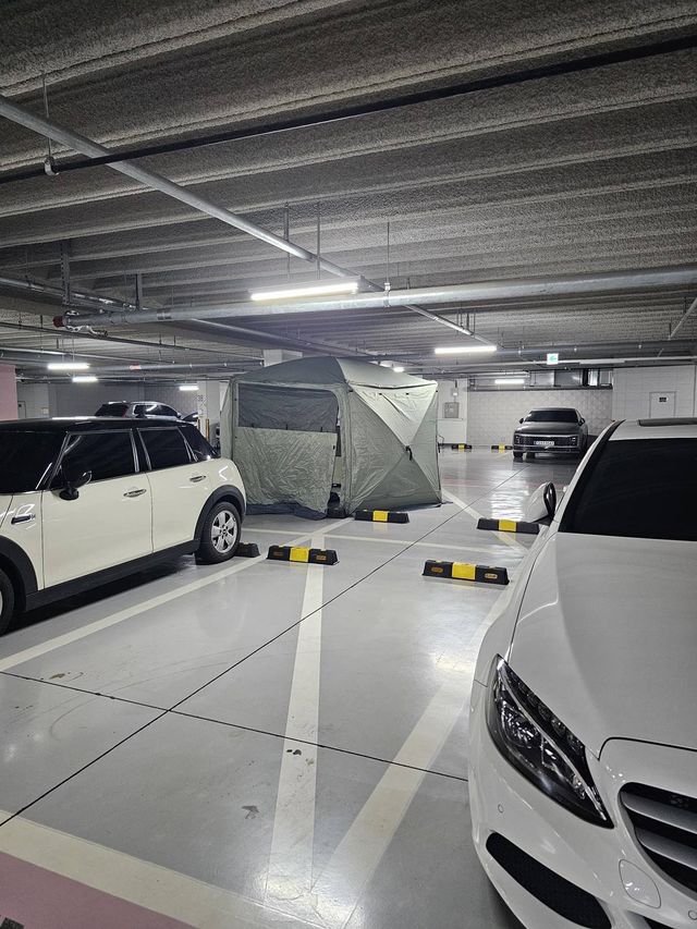 글쓴이 A 씨는 "아파트 지하 주차장에 차량 보러 내려갔는데 이게 웬 걸"이라며 "큰 텐트가 쳐져 있었는데 압도적 크기에 순간 내가 뭘 잘못 봤나 싶었다"고 적었다.