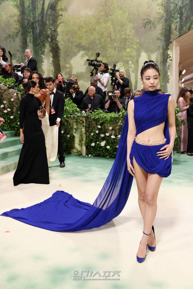 이날 제니는 코발트블루 컬러의 드레스를 착용해 눈길을 끌었다. 허리선과 각선미가 돋보이는 드레이핑 드레스다. 특히 허리 라인에 진주 장식의 체인을 스타일링했다.