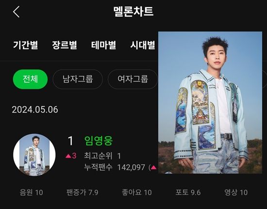 지난 7일 멜론에 따르면 임영웅은 아티스트 차트에서 전체 부문에서 1위를 차지했다.